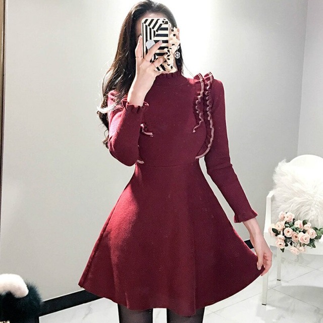 冬 スタンドネック フリルパッチワーク ニット Vestidos スイング カジュアル セーター ドレス